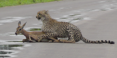 Կրյուգեր ազգային պարկում զբոսաշրջիկները վայրի բնության ամենահետաքրքիր տեսարաններից մեկին են ականատես եղել: Հեպարդը հասել էր իր որսին հենց ճանապարհի կենտրոնում: Չնայած անցնող մեքենաներին, հեպարդը չէր շտապում հեռանալ, իսկ այծքաղը հուսահատ փորձեր էր անում փախչելու:  Վերջ ի վերջո, հեպարդը բռնում է որսի կոկորդից և հեռանում անտա...