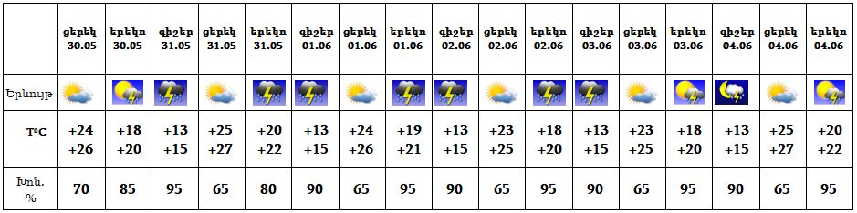 Մայիսի 30-ին, հունիսի 3-4-ը՝ կեսօրից հետո և գիշերվա առաջին կեսին, մայիսի 31-ին, հունիսի 1-2-ը ժամանակ առ ժամանակ սպասվում է անձրև և ամպրոպ, ամպրոպի ժամանակ` քամու ուժգնացում՝ 15-20 մ/վ արագությամբ: