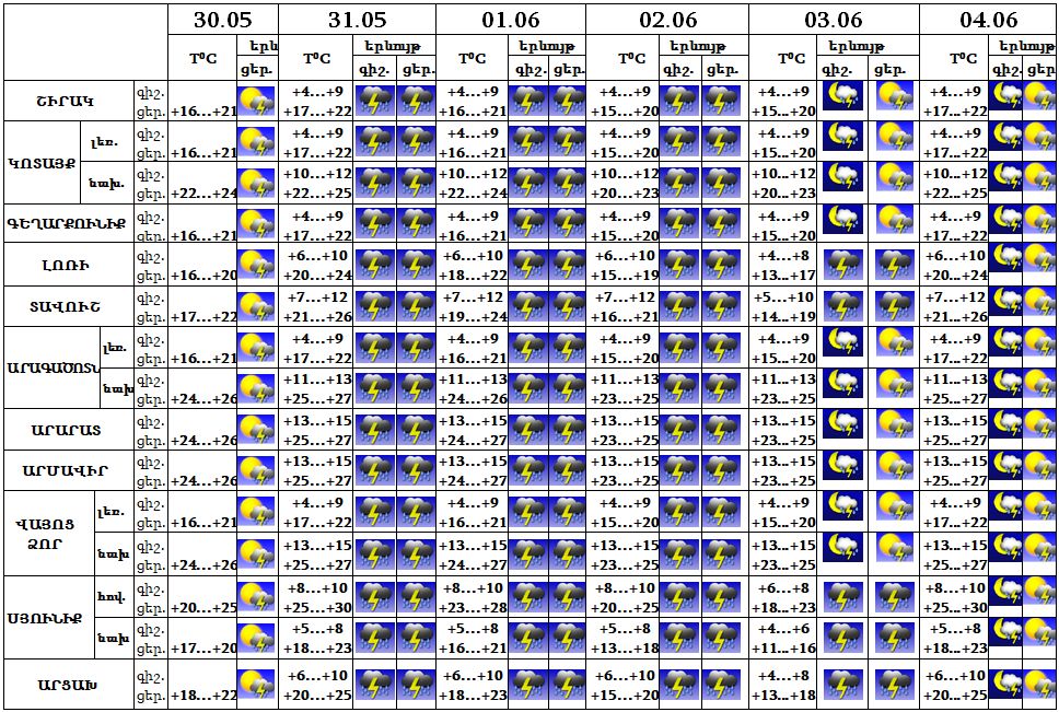 Մայիսի 30-ին, հունիսի 3-4-ը՝ կեսօրից հետո և գիշերվա առաջին կեսին, մայիսի 31-ին, հունիսի 1-2-ը ժամանակ առ ժամանակ շրջանների զգալի մասում սպասվում է անձրև և ամպրոպ, ամպրոպի ժամանակ՝ քամու ուժգնացում` 15-20 մ/վ արագությամբ, առանձին հատվածներում սպասվում է նաև կարկուտ: