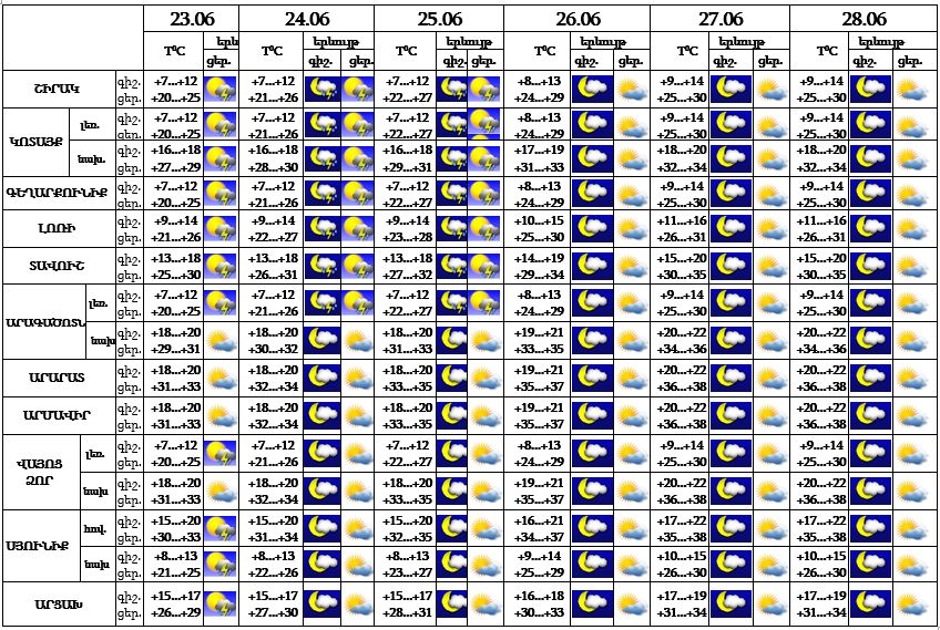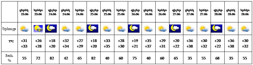 Հունիսի 23-ին առանձին շրջաններում, 24-25-ը՝ հյուսիսային շրջաններում երեկոյան ժամերին և գիշերը սպասվում է անձրև և ամպրոպ, ամպրոպի ժամանակ՝ քամու ուժգնացում` 15-20 մ/վ արագությամբ, առանձին հատվածներում հնարավոր է նաև կարկուտ: 26-28-ը սպասվում է առանց տեղումների եղանակ: