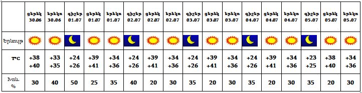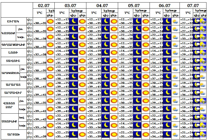 Հուլիսի 2-ի ցերեկը, 3-6-ը սպասվում է առանց տեղումների եղանակ, 7-ին՝ երեկոյան ժամերին, քաղաքի առանձին հատվածներում հնարավոր է կարճատև անձրև և ամպրոպ: