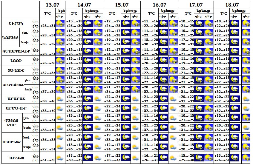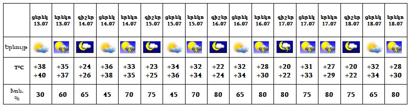 Հուլիսի 13-16-ը հյուսիսային շրջաններում, 17-ին շրջանների զգալի մասում, 18-ին առանձին շրջաններում կեսօրից հետո սպասվում է անձրև և ամպրոպ, առանձին վայրերում հնարավոր է նաև կարկուտ: