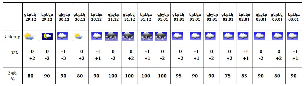 Դեկտեմբերի 29-ի ցերեկը, 30-ին, հունվարի 2-3-ը սպասվում է առանց տեղումների եղանակ: Դեկտեմբերի 31-ին և հունվարի 1-ի գիշերը հնարավոր է թույլ ձյուն։