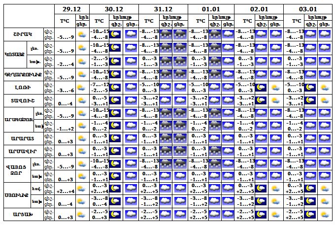 Դեկտեմբերի 29-ի ցերեկը, 30-ին, հունվարի 2-3-ը սպասվում է առանց տեղումների եղանակ: Դեկտեմբերի 31-ին և հունվարի 1-ի գիշերն առանձին շրջաններում սպասվում է ձյուն։ Քամին՝ հյուսիս-արևելյան՝ 3-8 մ/վ: Օդի ջերմաստիճանը դեկտեմբերի 30-ից հունվարի 1-ի գիշերը կբարձրանա 4-6 աստիճանով: