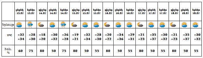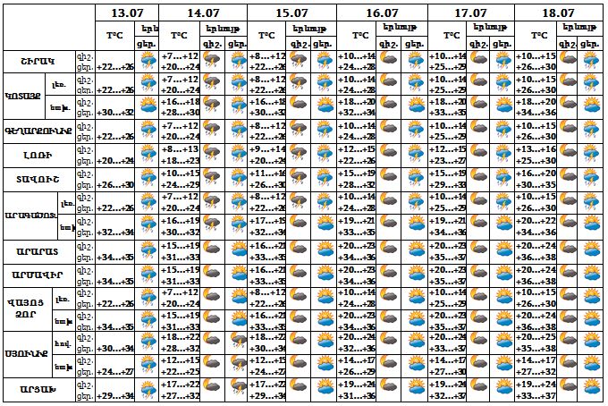 Հուլիսի 13-ի ցերեկը շրջանների զգալի մասում, 14-18-ն առանձին շրջաններում սպասվում է կարճատև անձրև և ամպրոպ, առանձին վայրերում հնարավոր է նաև կարկուտ: Քամին՝ հյուսիս-արևելյան՝ 3-8 մ/վ, ամպրոպի ժամանակ հնարավոր է քամու ուժգնացում՝ 20-25 մ/վ: Օդի ջերմաստիճանը հուլիսի 13-14-ն աստիճանաբար կնվազի 2-3 աստիճանով, 15-18-ը կբարձրանա 3-5 աստիճանով։