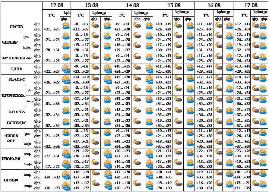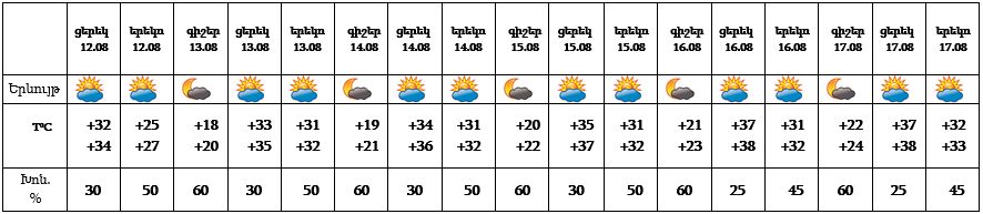 Երևան քաղաքում՝ օգոստոսի 12-ի ցերեկը, 13-17-ը սպասվում է առանց տեղումների եղանակ, երեկոյան ժամերին սպասվում է քամու ուժգնացում՝ 15-20 մ/վ։