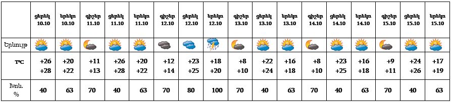 Հանրապետության տարածքում՝ հոկտեմբերի 10-ի ցերեկը, 11-ին, 12-ի գիշերը, 13-15-ը սպասվում է առանց տեղումների եղանակ, 12-ի ցերեկը շրջանների զգալի մասում սպասվում է անձրև և ամպրոպ, ամպրոպի ժամանակ սպասվում է քամու ուժգնացում՝ 15-20 մ/վ։ Քամին՝ հարավ-արևելյան՝ 3-8 մ/վ: Օդի ջերմաստիճանը 12-ի ցերեկը, 13-ին աստիճանաբար կնվազի 4-6 աստիճանով։