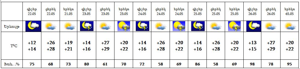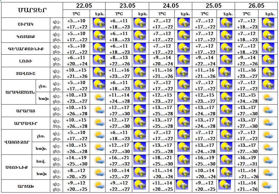 Մայիսի 22-ին, 26-ին առանձին շրջաններում, 23-25-ին շրջանների մեծ մասում գիշերվա առաջին կեսին և օրվա երկրորդ կեսին սպասվում է կարճատև անձրև և ամպրոպ, առանձին հատվածներում հնարավոր է կարկուտ: Քամին՝ հարավ-արևմտյան 2-7 մ/վրկ արագությամբ, ամպրոպի ժամանակ հնարավոր է քամու ուժգնացում‵ 15-20 մ/վրկ: Օդի ջերմաստիճանը 23-ին կբարձրանա 2-3 աստիճանով: