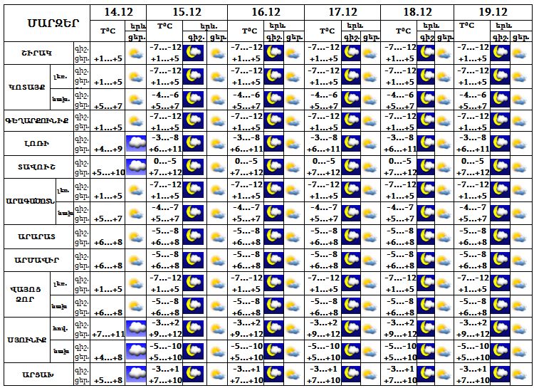 Դեկտեմբերի 14-ի ցերեկը, 15-19-ը սպասվում է առանց տեղումների եղանակ: