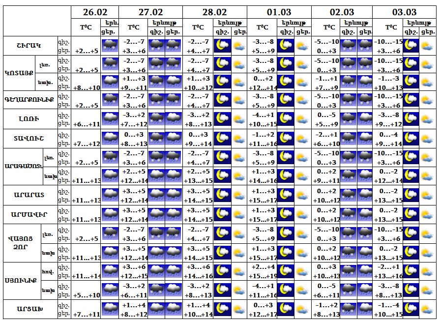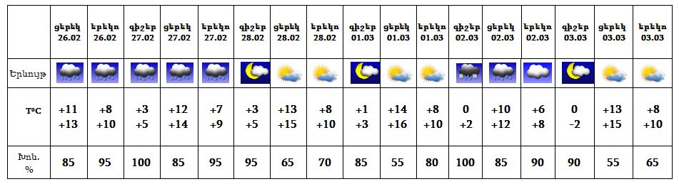 Փետրվարի 26-ի ցերեկը, 27-ին, մարտի 2-ի գիշերը և օրվա առաջին կեսին շրջանների զգալի մասում, ցերեկը Վայոց ձորում, Սյունիքում և Արցախում ժամանակ առ ժամանակ սպասվում են տեղումներ: Փետրվարի 28-ին, մարտի 1-ին, 3-ին սպասվում է առանց տեղումների եղանակ: