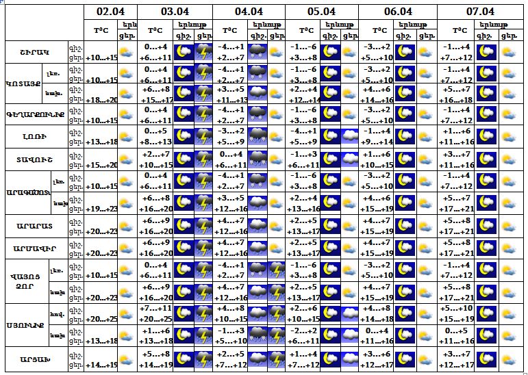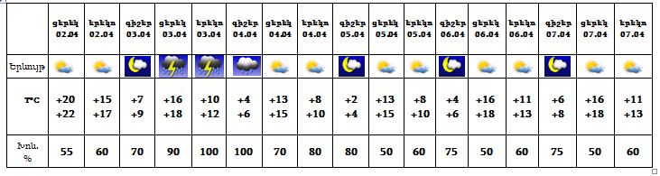 Ապրիլի 2-ի ցերեկը, 3-ի գիշերը, 4-ի ցերեկը, 5-7-ին սպասվում է առանց տեղումների եղանակ: Ապրիլի 3-ի ցերեկը և 4-ի գիշերը սպասվում է անձրև և ամպրոպ, ամպրոպի ժամանակ քամու ուժգնացում՝ 16-18մ/վրկ: