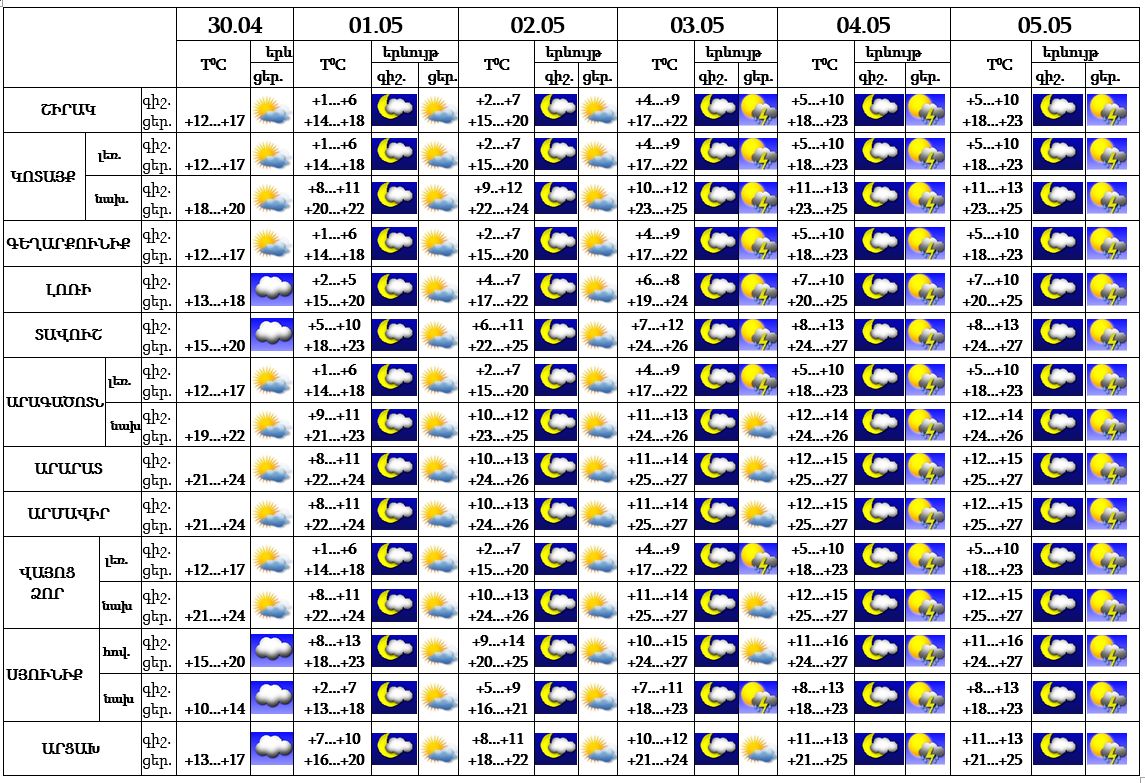 Ապրիլի 30-ի ցերեկը, մայիսի 1-2-ը, 3-ի գիշերը սպասվում է առանց տեղումների եղանակ: Մայիսի 3-ին երեկոյան ժամերին առանձին շրջաններում, 4-5-ը կեսօրից հետո շրջանների զգալի մասում սպասվում է կարճատև անձրև և ամպրոպ, առանձին հատվածներում հնարավոր է նաև կարկուտ: