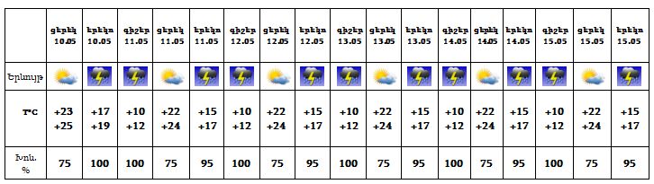 Մայիսի 10-ին՝ կեսօրից հետո, 11-15-ը ժամանակ առ ժամանակ սպասվում է անձրև և ամպրոպ, ամպրոպի ժամանակ` քամու ուժգնացում՝ 14-19 մ/վ: